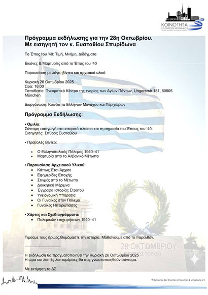 Η μαζική συμμετοχή της καθεμιάς και του καθένα χωριστά, όπως και συνολικά του ελληνισμού του Μονάχου θα αποτελέσει ένα θετικό πρώτο βήμα για την επιτυχή συνέχεια της προσπάθειας να έχουμε ξανά στο Μόναχο μια Ελληνική Κοινότητα που να ανταποκρίνεται στις ανάγκες μας!